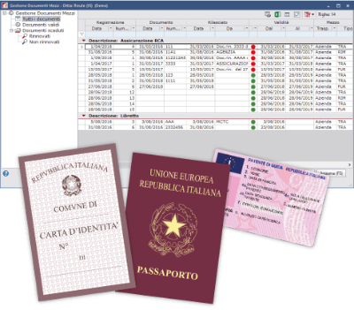 Si possono gestire le anagrafiche complete di autisti e mezzi ed i loro documenti: Patenti, Assicurazioni, Revisioni ecc, che permetterà all'operatore una ricerca ed un'interrogazione semplice e veloce del documento e dei file PDF allegati, di tutte le scadenze generate, gestire le validità ed i rinnovi e configurare il comportamento del programma in caso di presenza di documenti scaduti e non rinnovati.